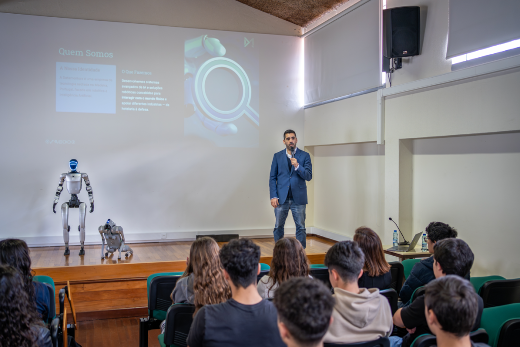 A sessão teve início com uma explicação detalhada sobre o conceito de IA Física, uma área que combina algoritmos inteligentes com dispositivos capazes de interagir autonomamente com o ambiente. O CEO da empresa Eliano Marques sublinhou que esta tecnologia já está presente em setores como a saúde, a indústria, a investigação científica e a mobilidade, e que terá impacto direto nas profissões do futuro a curto e médio prazo.